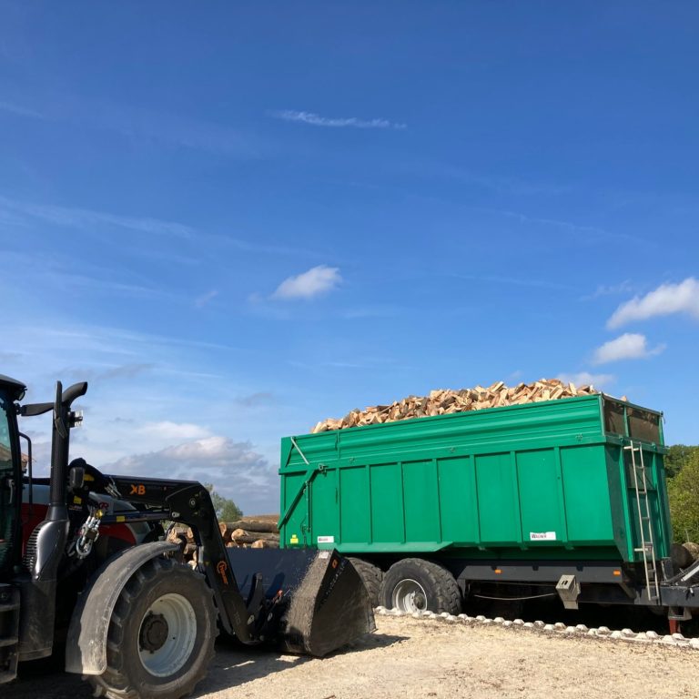 Größere Brennholzmengen liefern wir mit Schlepper und großem Kipper.