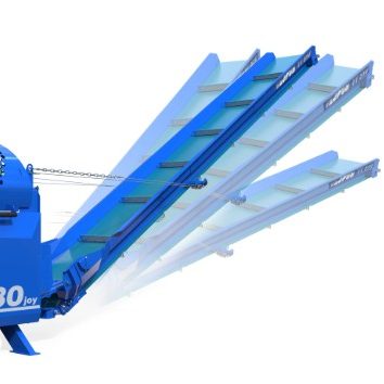 Das 5 Meter lange, schwenkbare Förderband ermöglicht eine saubere und effiziente Übergabe der Holzscheite direkt auf Anhänger, in Container oder auf den Lagerplatz – ohne zusätzliche Handarbeit.