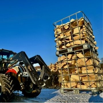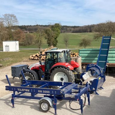 Im Lager beginnt die technische Aufbereitung des Holzes. Die Stämme werden mit unserem Sägespaltautomaten in ofenfertige Scheite gesägt und gespalten. Durch diese Maschine können wir große Mengen Holz gleichmäßig und sauber spalten, sodass es perfekt für Kamin oder Ofen vorbereitet ist – für gleichbleibend hochwertige Lieferungen an unsere Kunden.